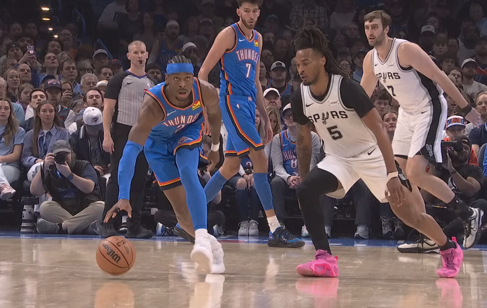 The Oklahoma City Thunder and the San Antonio Spurs meet for the fifth time so far this season on Wednesday evening—a scheduling quirk due to an extra meeting in the NBA Cup Semifinal—and it comes at a good time for the Thunder. OKC is coming off a couple of solid wins: a dominant victory against the Nuggets in Denver on Sunday and a blowout at home last night against the Orlando Magic. Now, the Thunder is hoping for a second win against the Spurs after losing the first three matchups.
