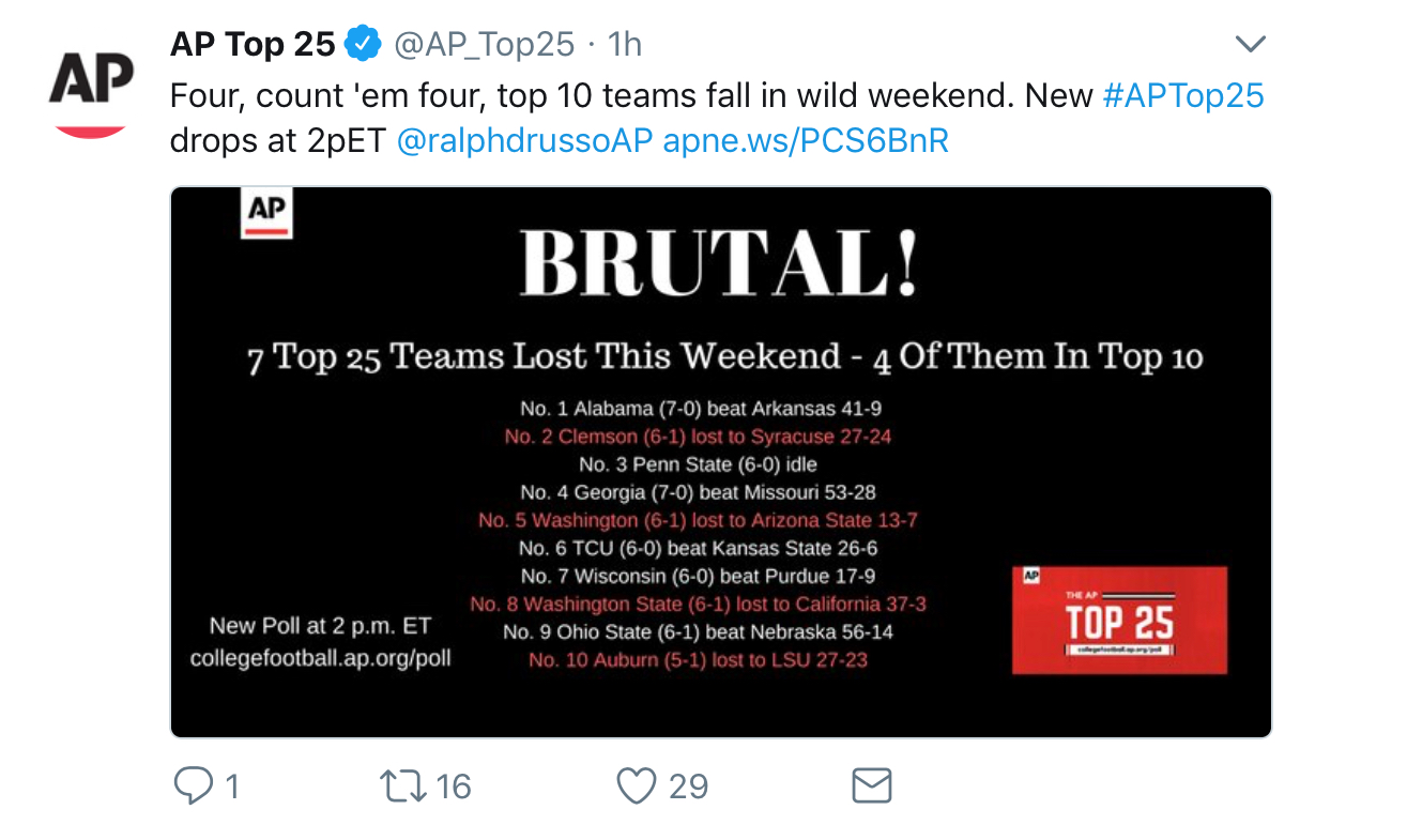 After a slip up, the Oklahoma Sooners dropped out of the college football playoff picture temporarily. However, receiving quite a bit of help, Baker Mayfield and the rest of the crew remain in the conversation. Four of the top ranked teams faltered on Saturday shaking up the CFP landscape whil allowing OU to re-enter the top ten.