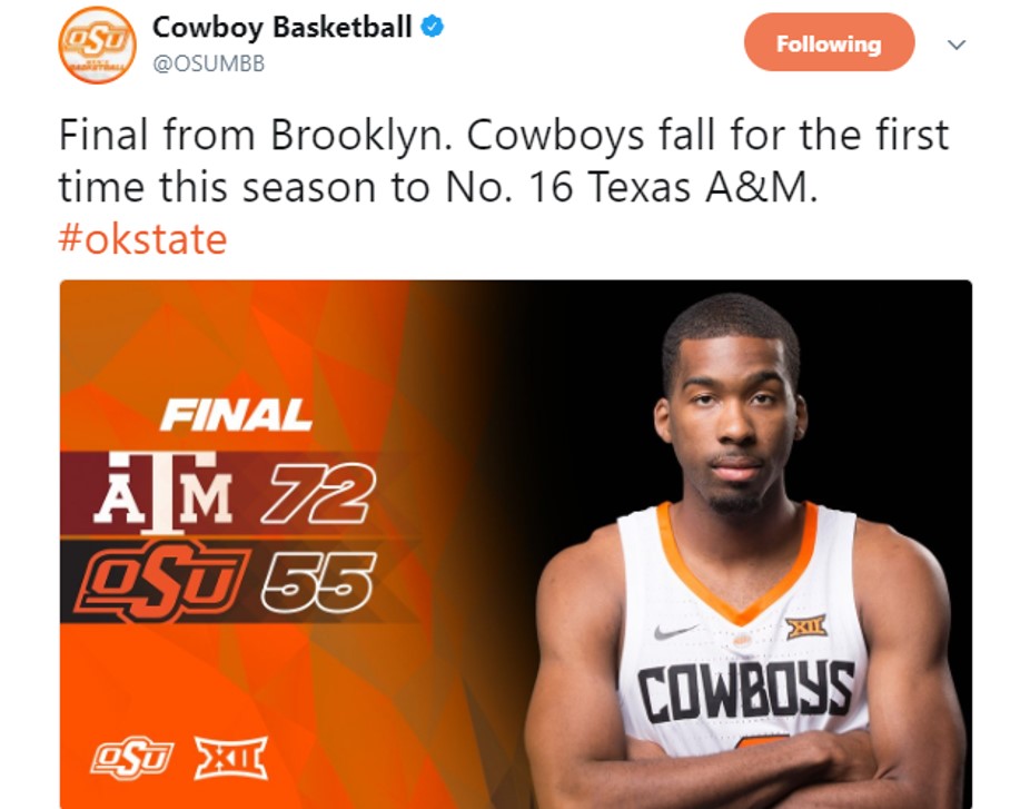 Final from Brooklyn. Cowboys fall for the first time this season to No. 16 Texas A&M. #okstate pic.twitter.com/qxVi84ea7P