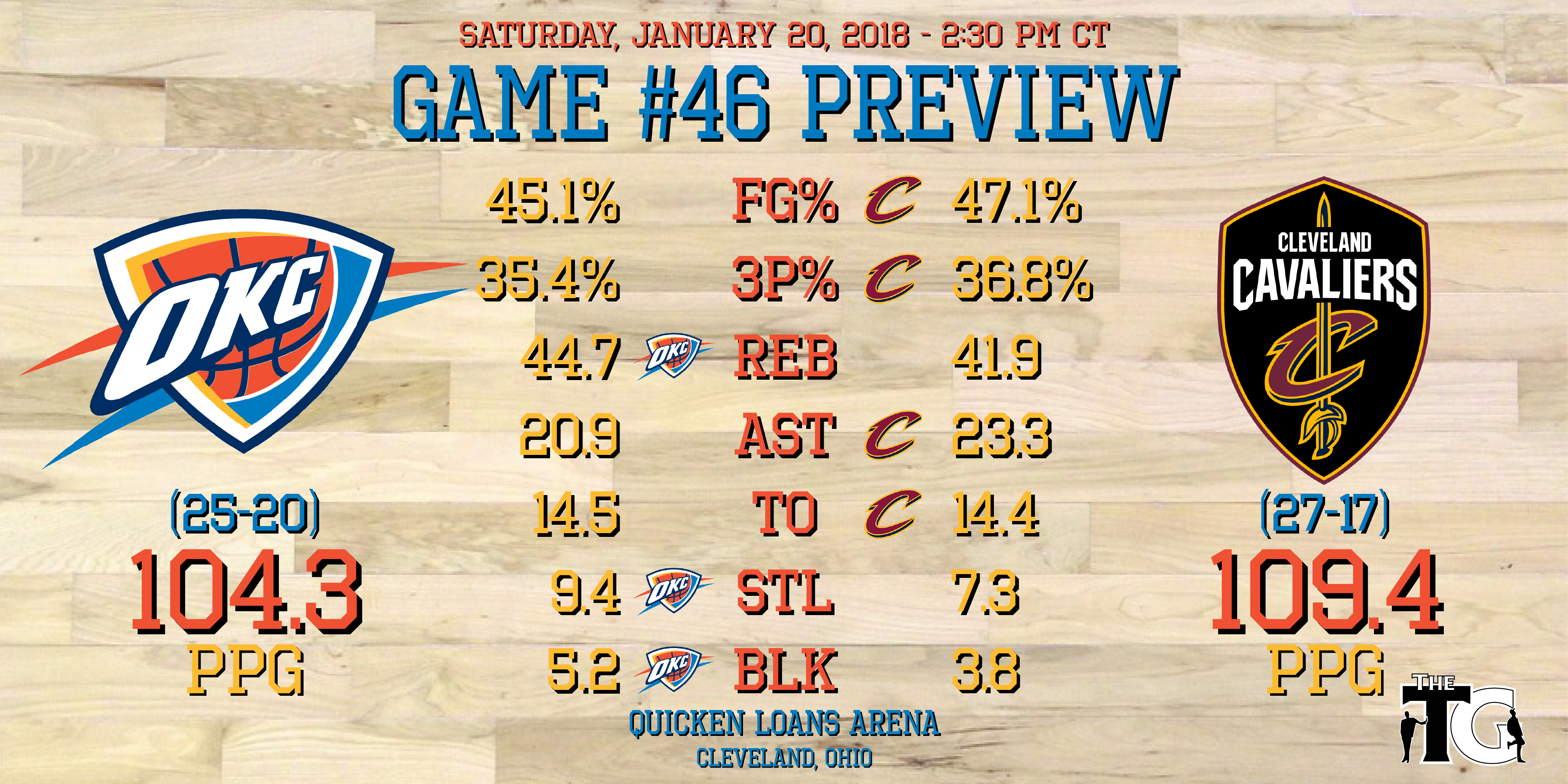 The Cleveland Cavaliers, however, have been singing a different tune lately. After winning 18 games in a 19-game stretch to put their record at 23-8, the Cavs have gone 4-9. Drama in Cleveland is nothing new, and Lebron is capable of breaking out to win just about any game single-handedly, but the Thunder has a good opportunity to go into Cleveland this afternoon and pick up a rare win.