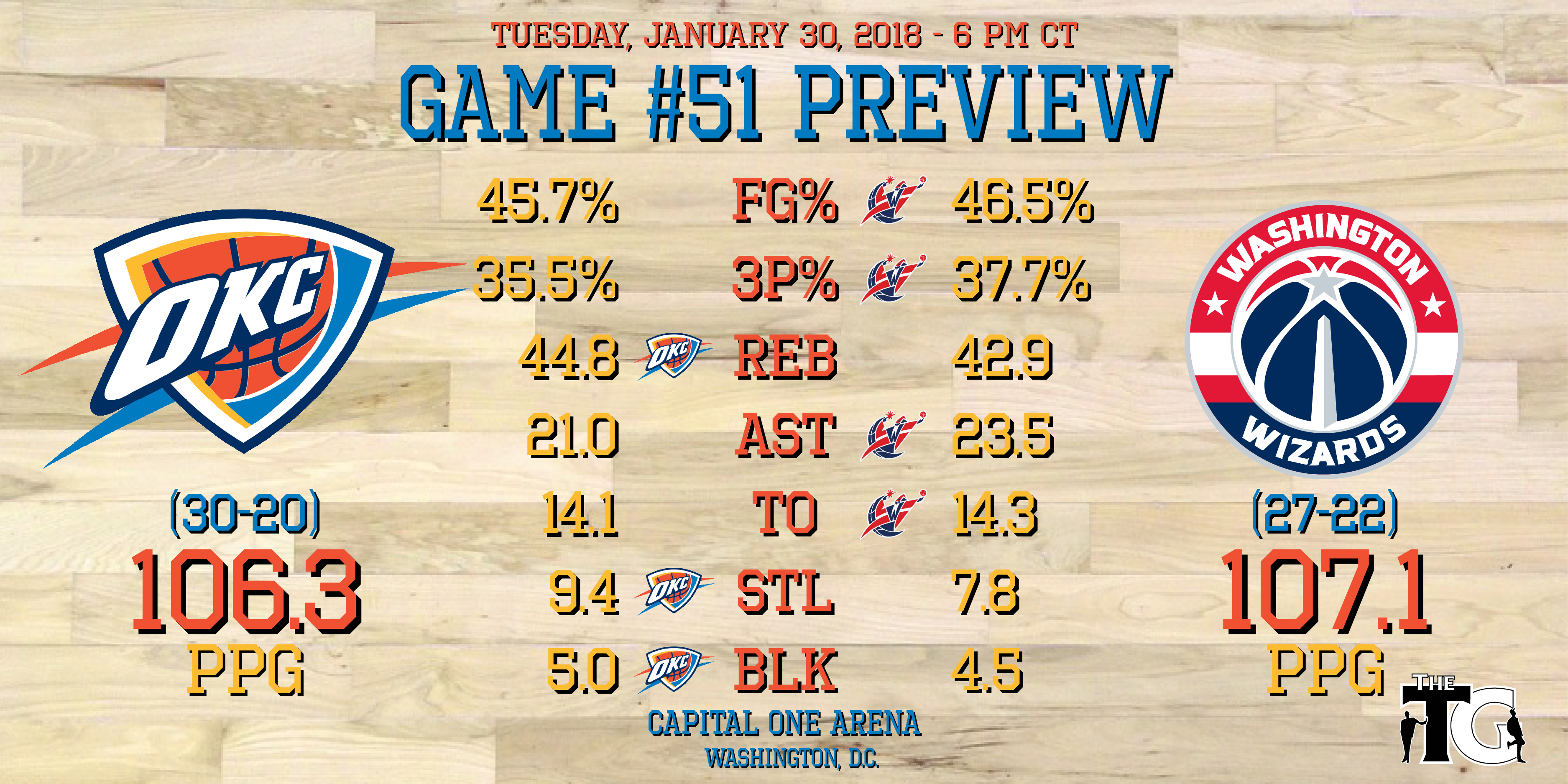 - Oklahoma City is 15-7 against the Eastern Conference, while Washington is 12-10 against the Western Conference.