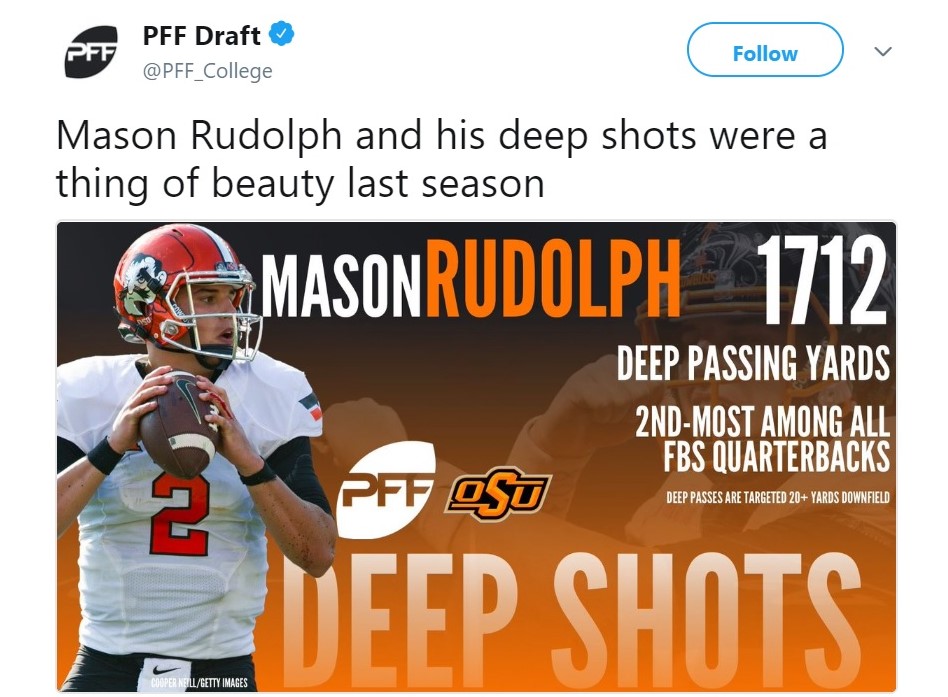 Mason Rudolph made a name for himself in the Big 12 when he led Oklahoma State to a come from behind win over Oklahoma in the 2014 Bedlam game. Over the next three years he established himself as a prolific passer and prototypical NFL quarterback.