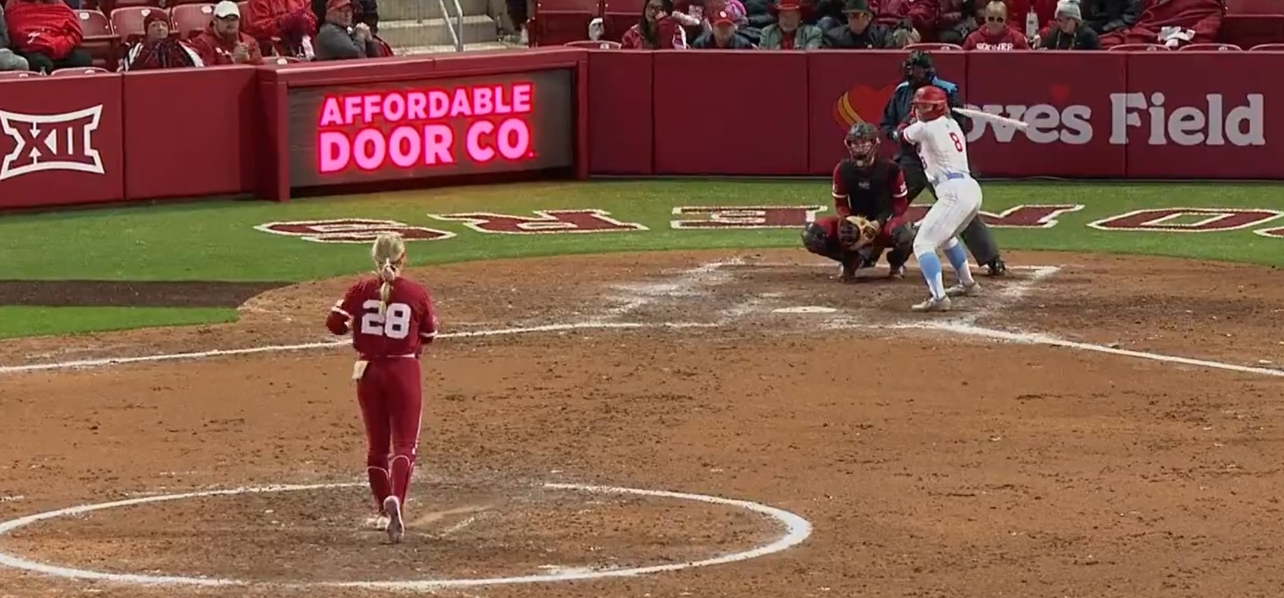 Back-to-Back home runs from Jayda Coleman and Kasidi Pickering helped turn a 3-3 contest into a 7-3 Sooner lead in the bottom of the sixth inning in first game of the day for Oklahoma. However, Miami used three consecutive home runs in the top of the seventh to knot it back up a 7-7. That’s when Kinzie Hansen stepped to the plate and further solidified her legacy as one of the best clutch hitters in program history. After Riley Booner led off the bottom half of the inning with a single, Hansen delivered a bomb, on a 2-2 pitch, to left-center field to walk off a win for the Sooners in their first game at the new stadium.
